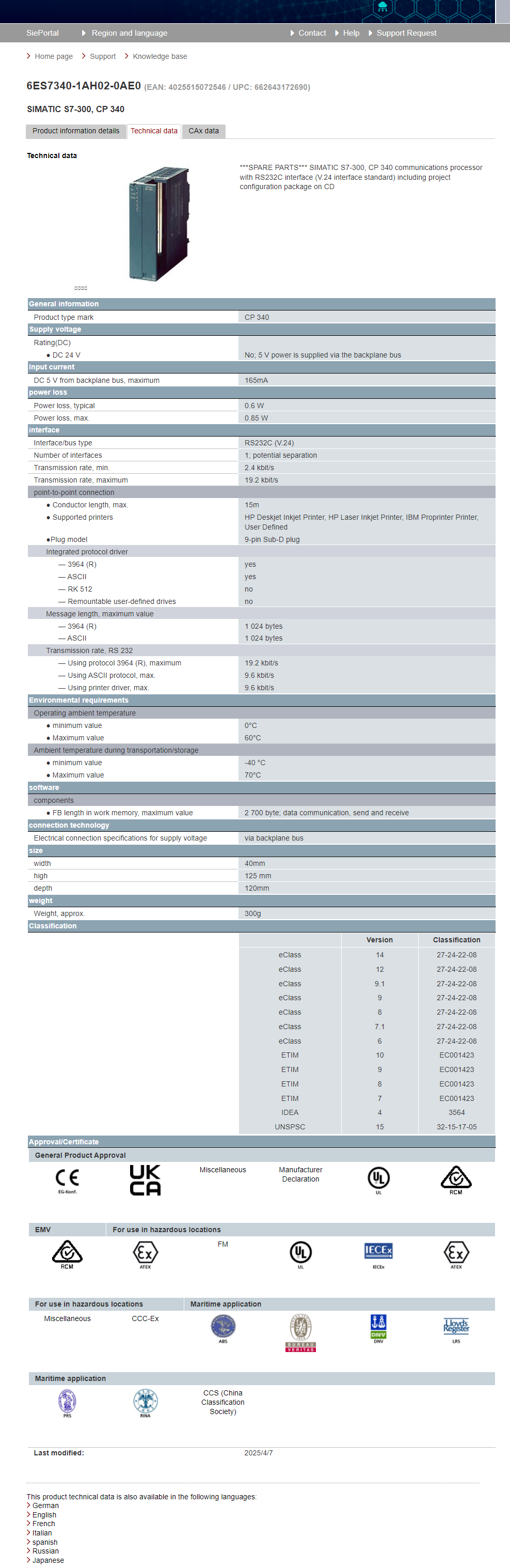 SIMATIC S7300, CP 340 communication processor 6ES7340-1AH02-0AE0