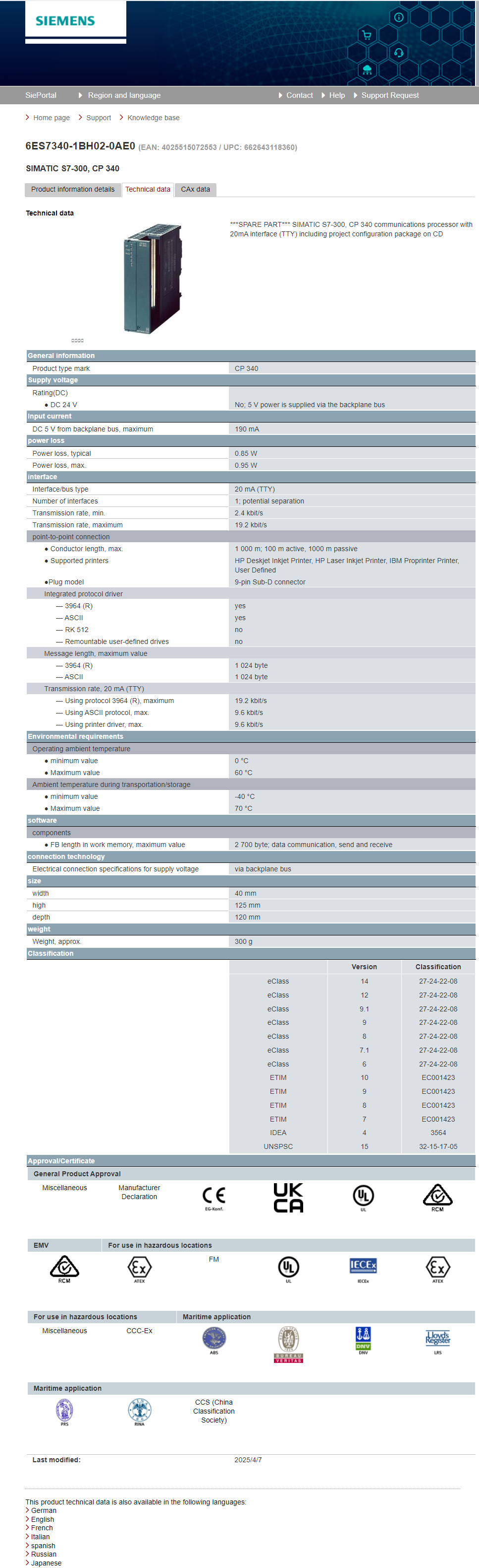 SIMATIC S7300, CP 340 communication processor 6ES7340-1BH02-0AE0