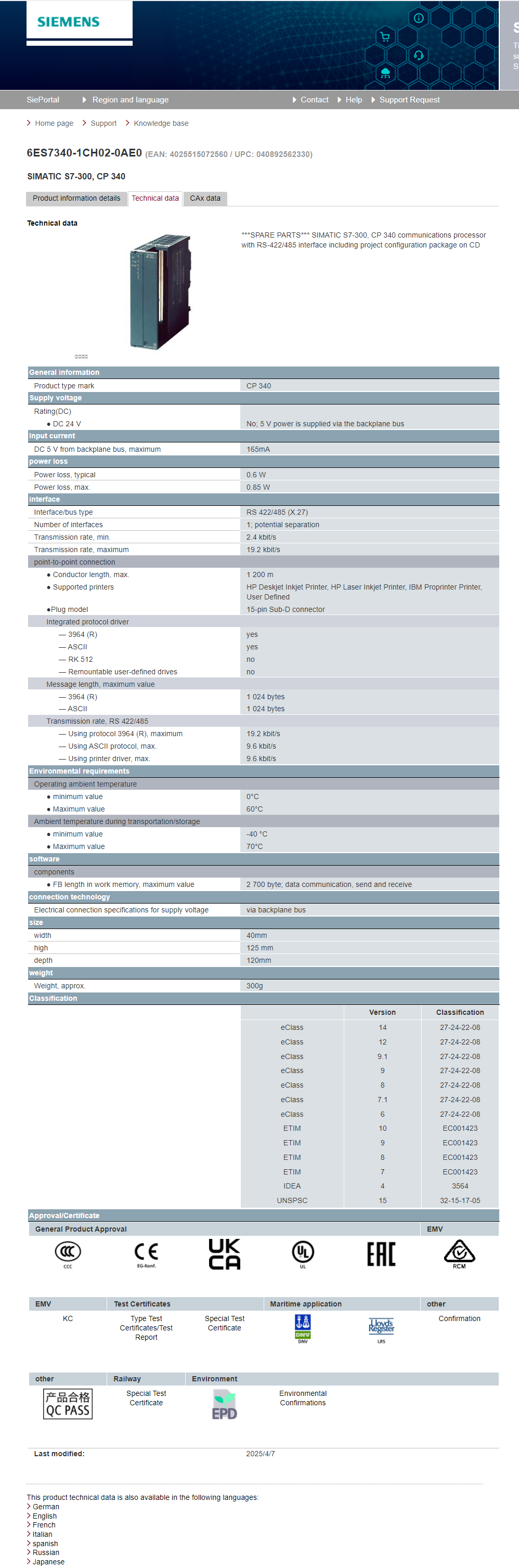 SIMATIC S7300, CP 340 communication processor 6ES7340-1CH02-0AE0
