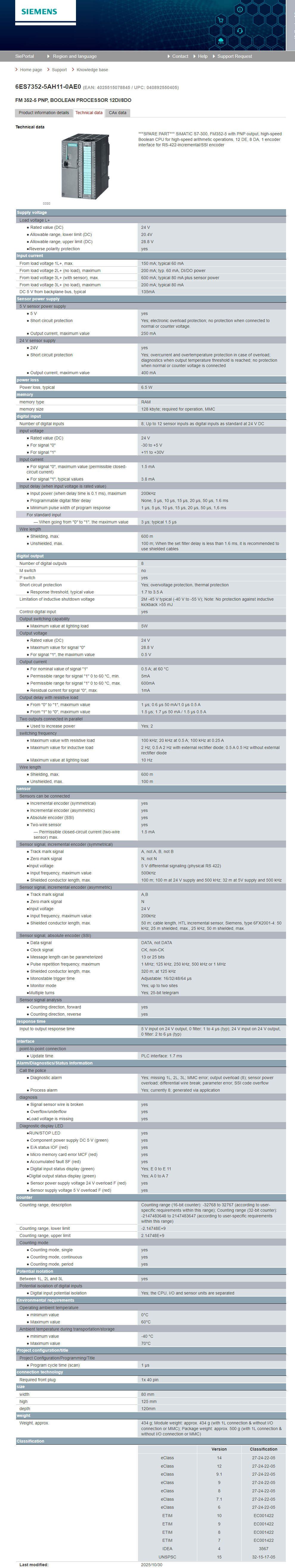 ***SPARE PART*** SIMATIC S7-300, FM352-5 with PNP output, high-speed Boolean CPU for high-speed arithmetic operations, 12 DE, 8 DA, 1 encoder interface for RS-422-incremental/SSI encoder