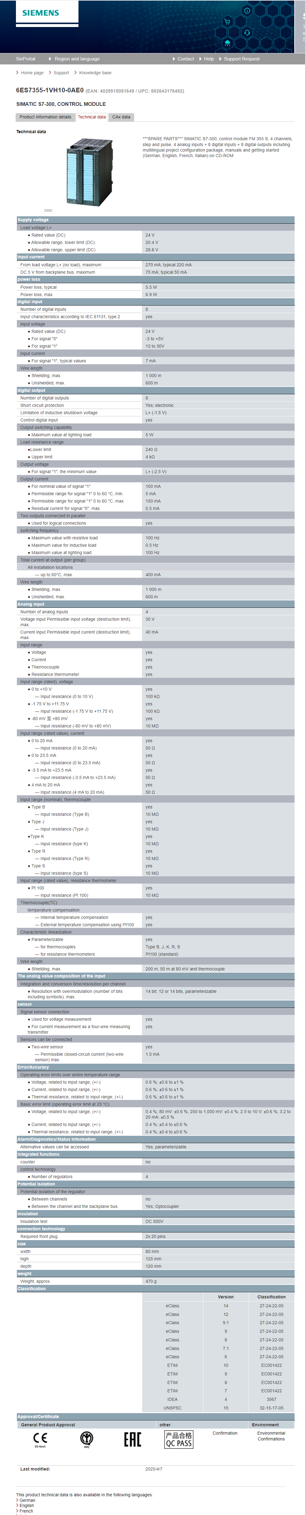 ***SPARE PARTS*** SIMATIC S7-300, control module FM 355 S, 4 channels, step and pulse, 4 analog inputs + 8 digital inputs + 8 digital outputs including multilingual project configuration package, manuals and getting started (German, English, French, Italian) on CD-ROM