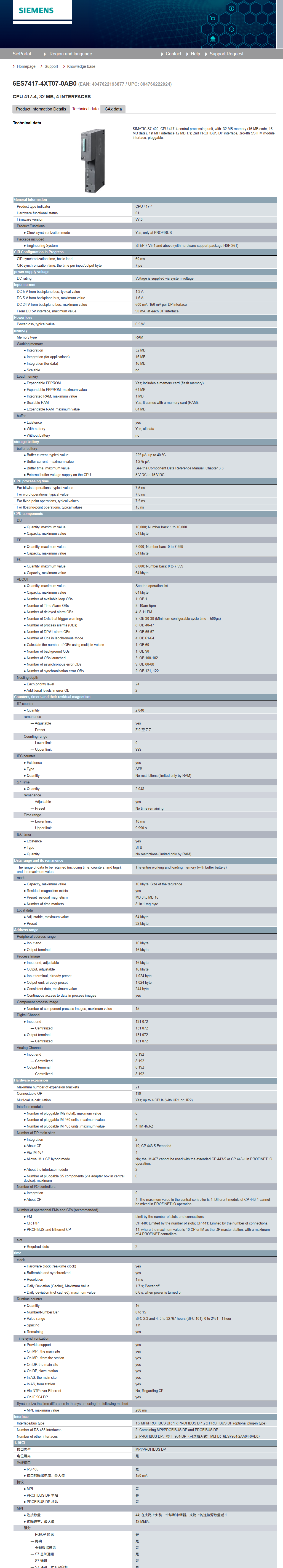 SIMATIC S7-400, CPU 417-4 central processing unit, with: 32 MB memory (16 MB code; 16 MB data), 1st MPI interface 12 MBIT/s; 2nd PROFIBUS DP interface, 3rd/4th SS IFM module interface, pluggable.