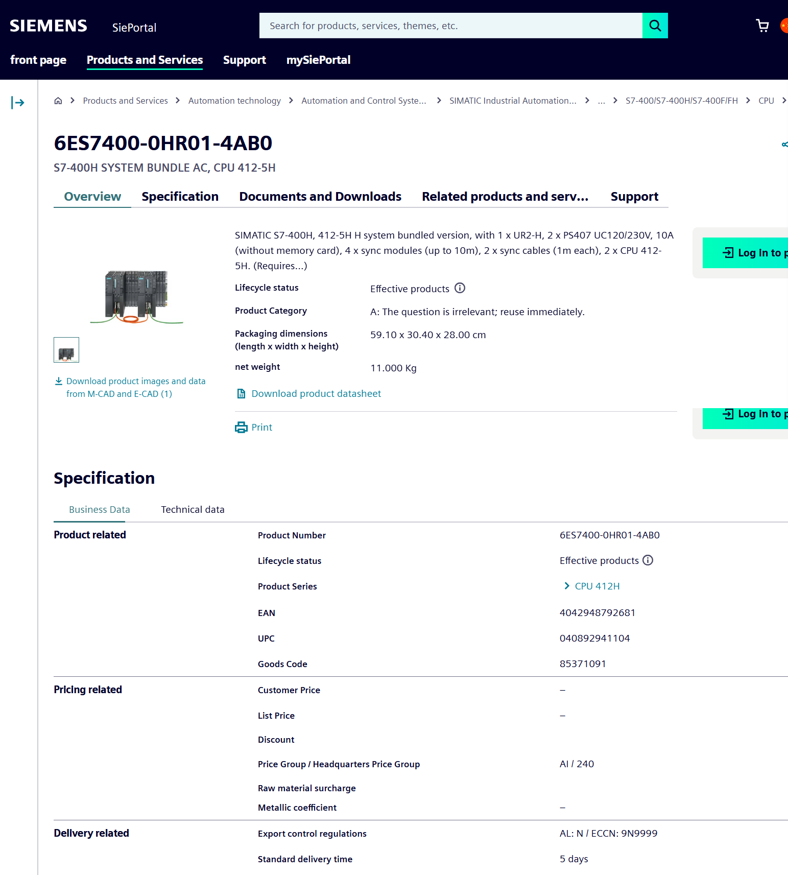 SIMATIC S7-400H, 412-5H H system bundled version, with 1 x UR2-H, 2 x PS407 UC120/230V, 10A (without memory card), 4 x sync modules (up to 10m), 2 x sync cables (1m each), 2 x CPU 412-5H. (Requires…)