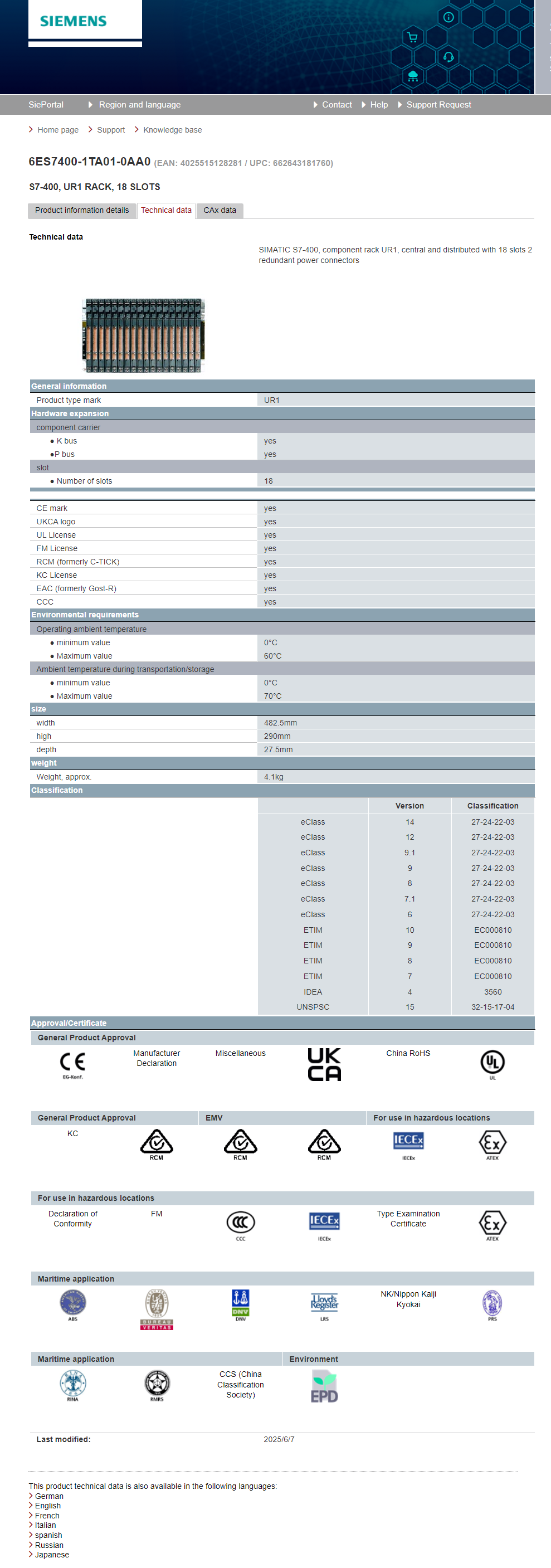 | SIMATIC S7-400, component rack UR1, central and distributed with 18 slots 2 redundant power connectors |