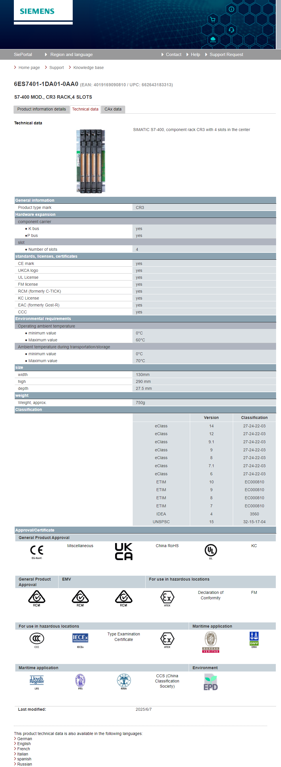 SIMATIC S7-400, component rack CR3 with 4 slots in the center 6ES7401-1DA01-0AA0