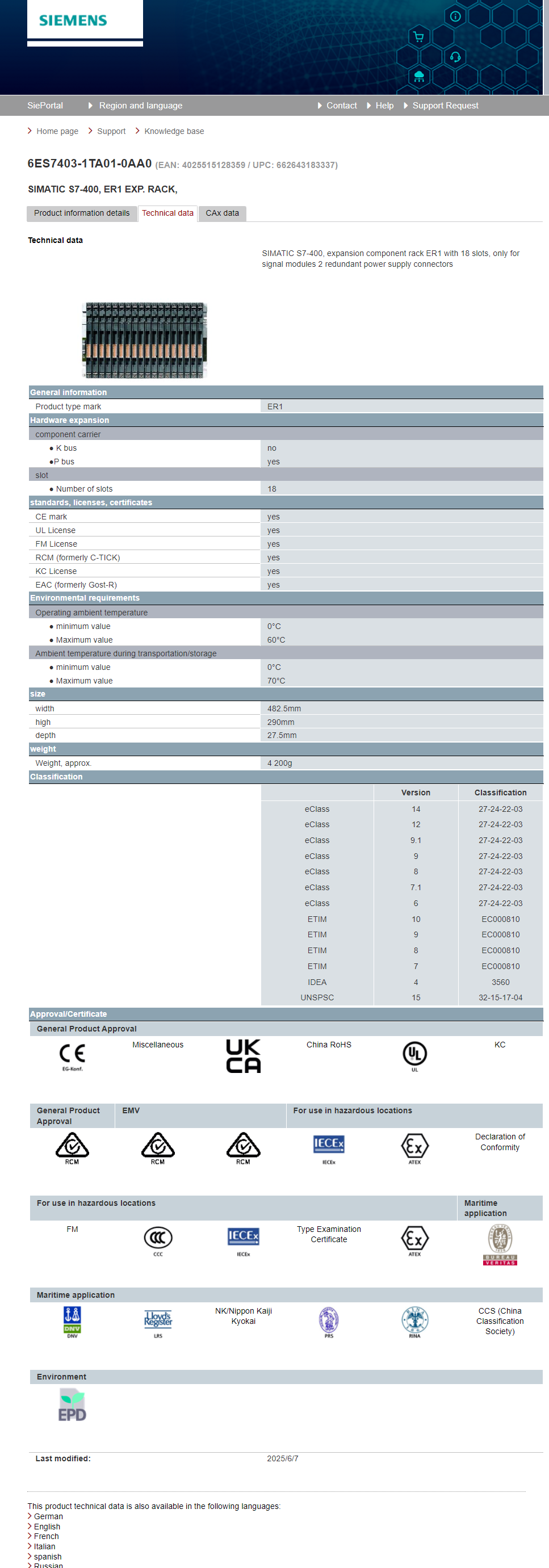 | SIMATIC S7-400, expansion component rack ER1 with 18 slots, only for signal modules 2 redundant power supply connectors |