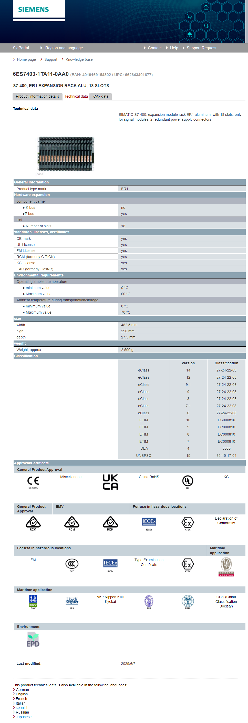 SIMATIC S7-400, expansion module rack ER1 aluminum 6ES7403-1TA11-0AA0