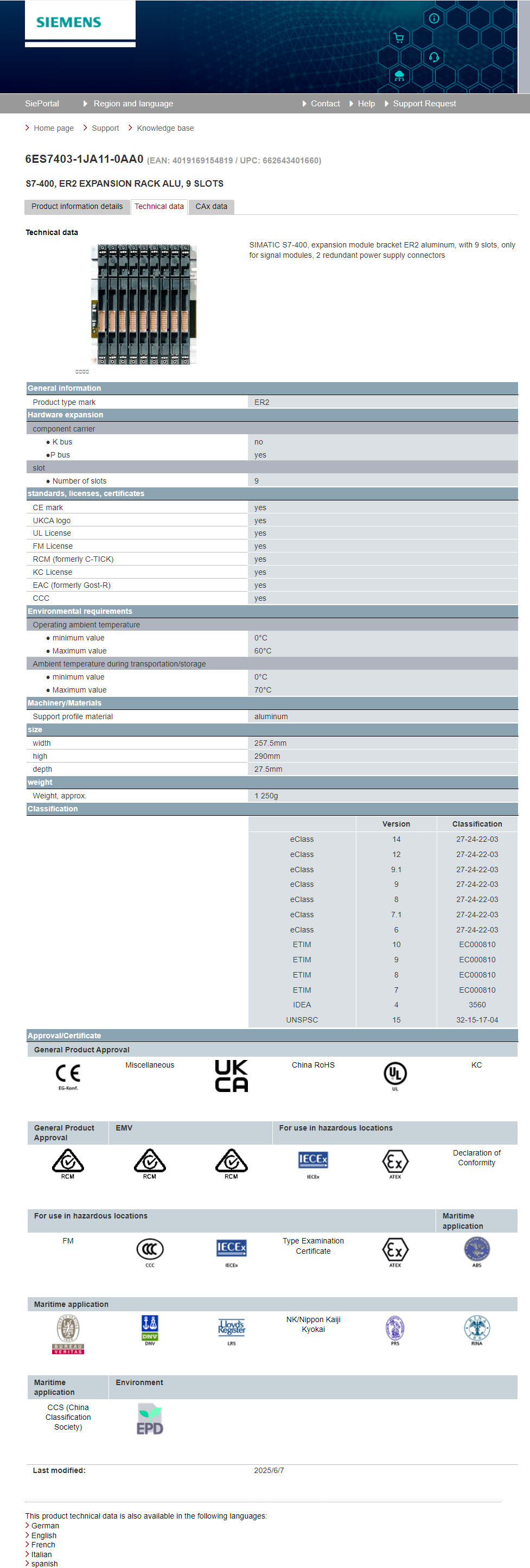 SIMATIC S7-400, expansion module bracket ER2 aluminum 6ES7403-1JA11-0AA0