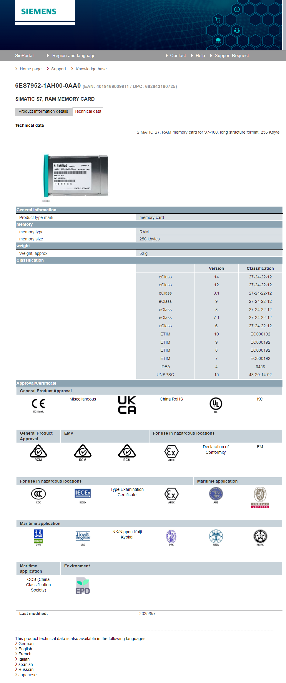 SIMATIC S7, RAM memory card for S7-400, long structure format, 256 Kbyte