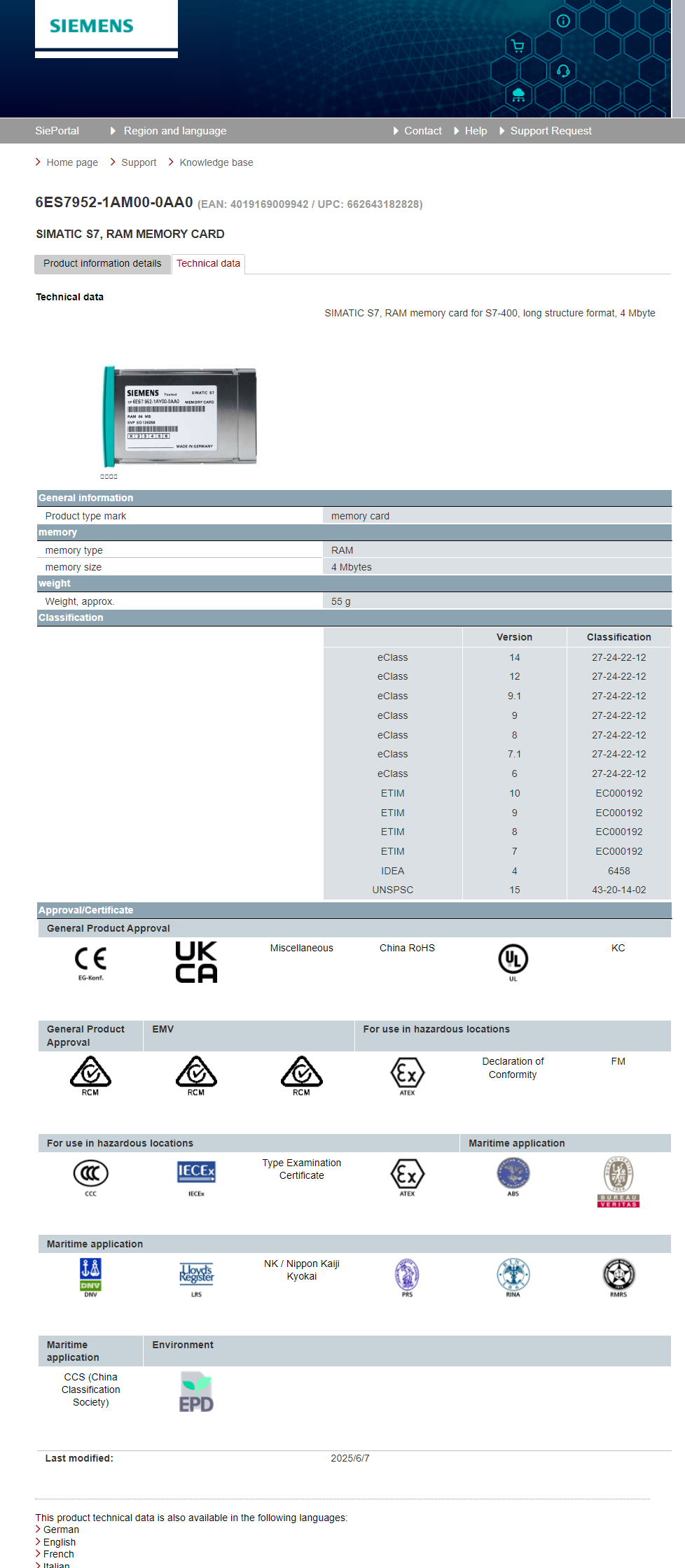 SIMATIC S7, RAM memory card for S7-400, long structure format, 4 Mbyte