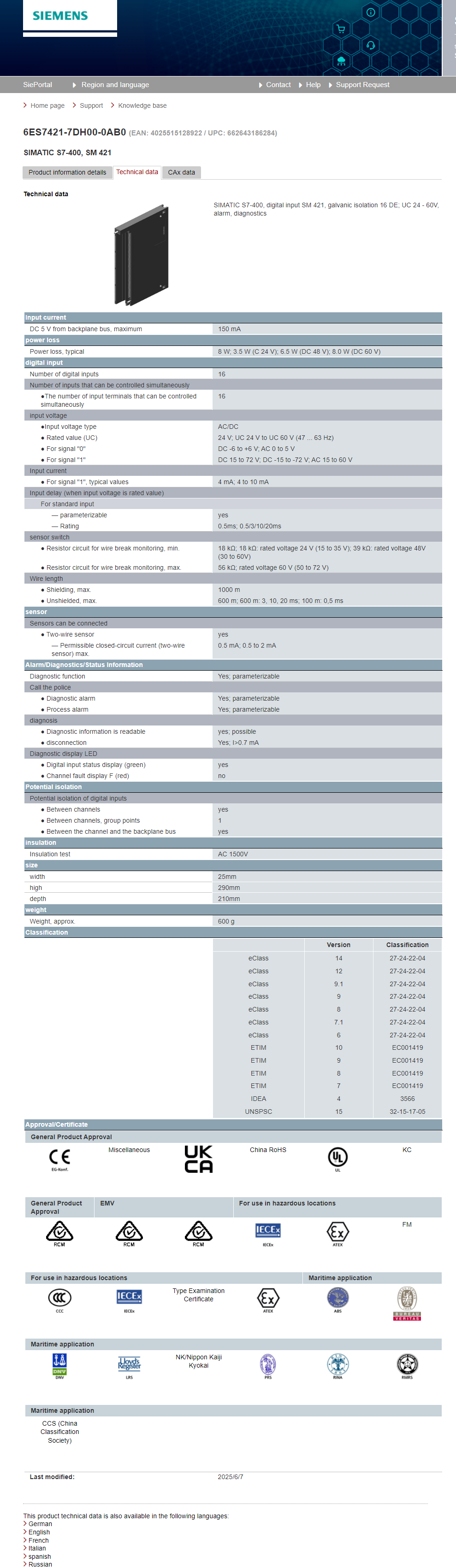 SIMATIC S7-400, digital input SM 421 6ES7421-7DH00-0AB0