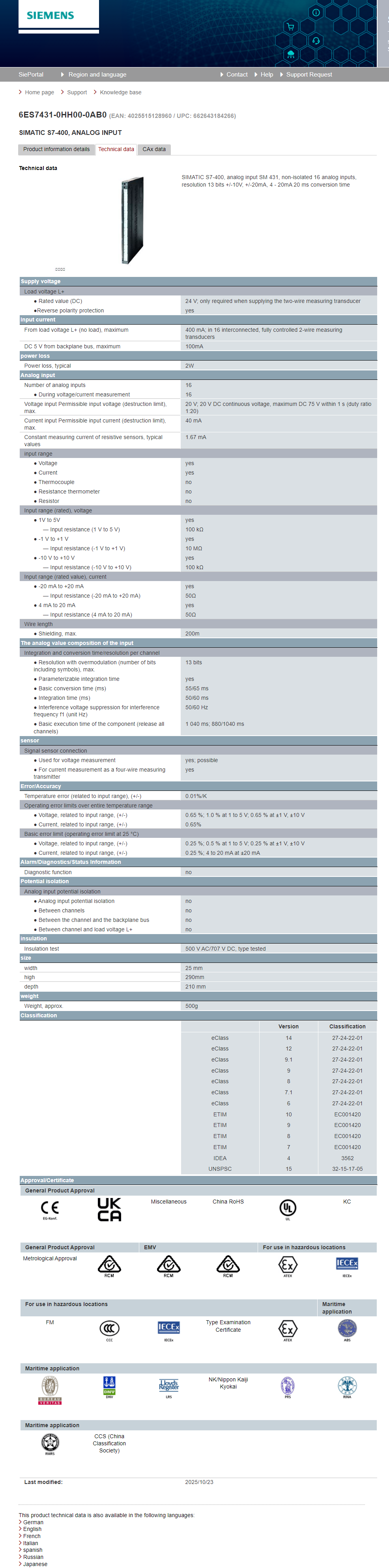 SIMATIC S7-400, analog input SM 431 6ES7431-0HH00-0AB0