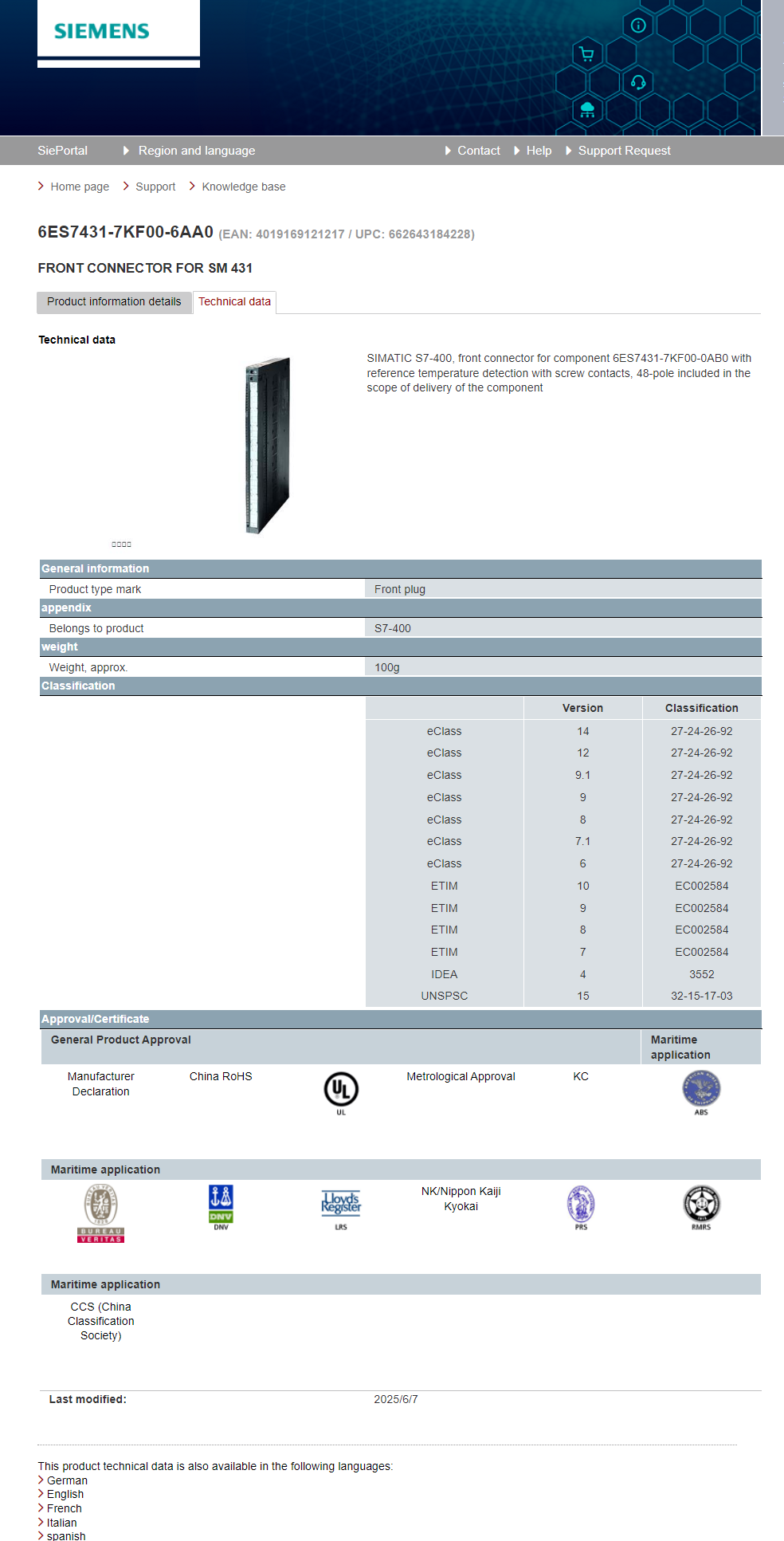 SIMATIC S7-400, front connector 6ES7431-7KF00-6AA0