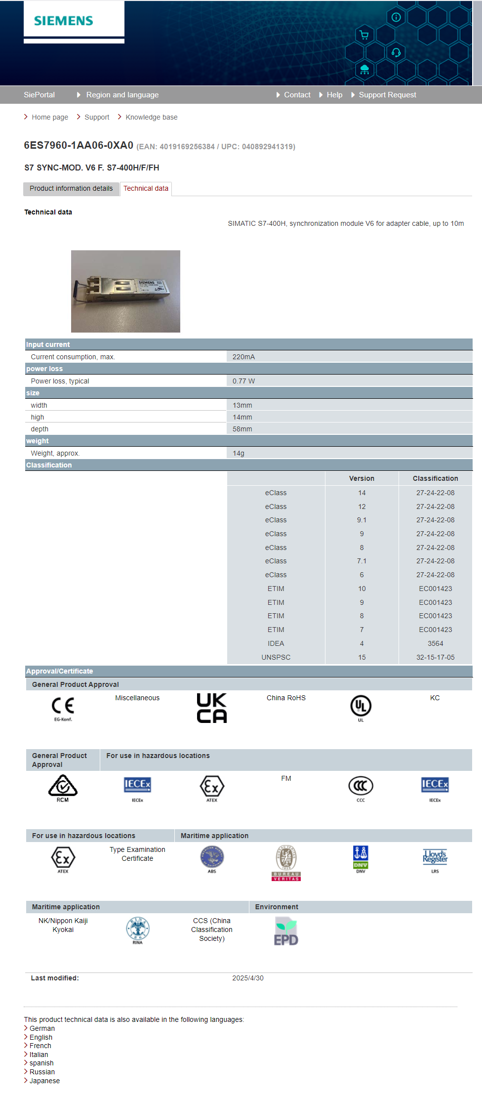 SIMATIC S7-400H, synchronization module 6ES7960-1AA06-0XA0