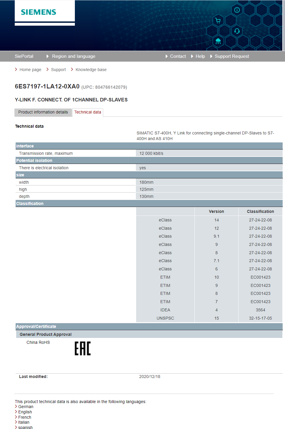 SIMATIC S7-400H, Y Link for connecting single-channel DP-Slaves to S7-400H and AS 410H 6ES7197-1LA12-0XA0