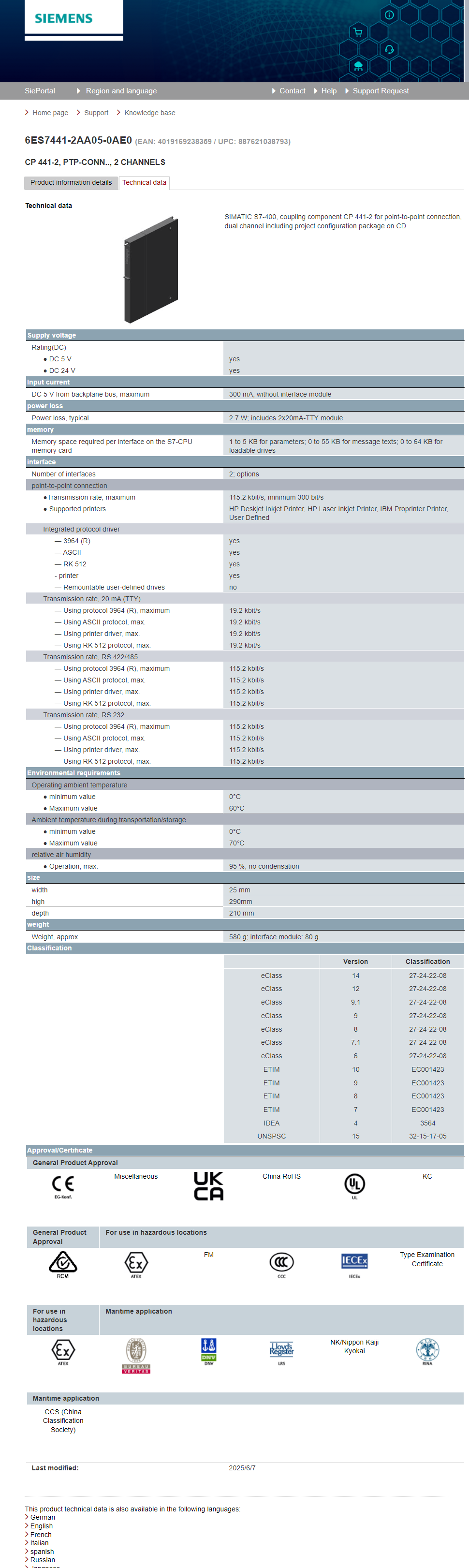 SIMATIC S7-400, coupling component CP 441-2 6ES7441-2AA05-0AE0