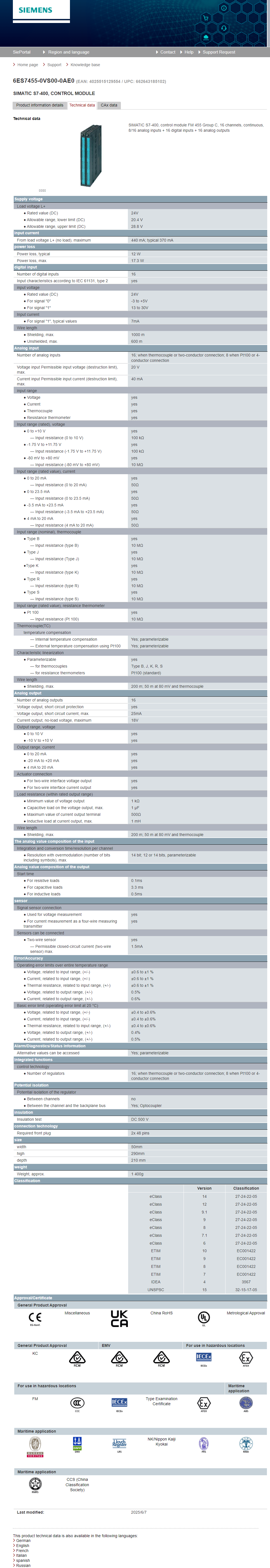 SIMATIC S7-400, control module FM 455 Group C, 16 channels, continuous, 8/16 analog inputs + 16 digital inputs + 16 analog outputs