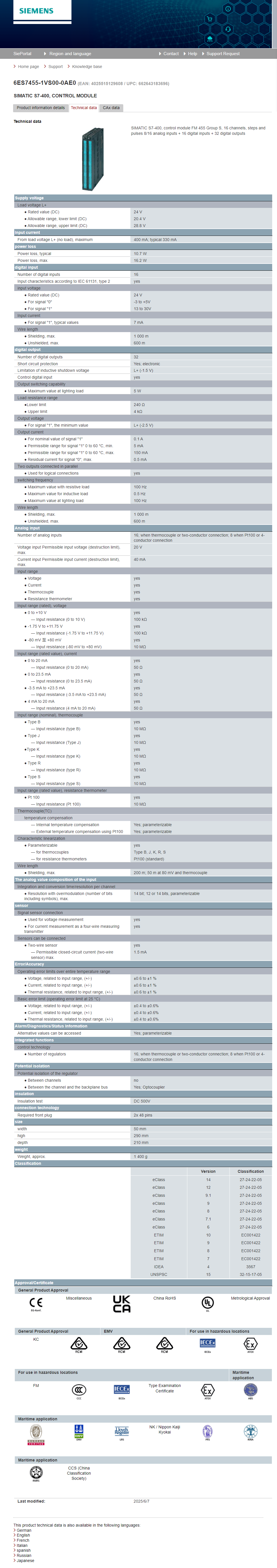 | SIMATIC S7-400, control module FM 455 Group S, 16 channels, steps and pulses 8/16 analog inputs + 16 digital inputs + 32 digital outputs |