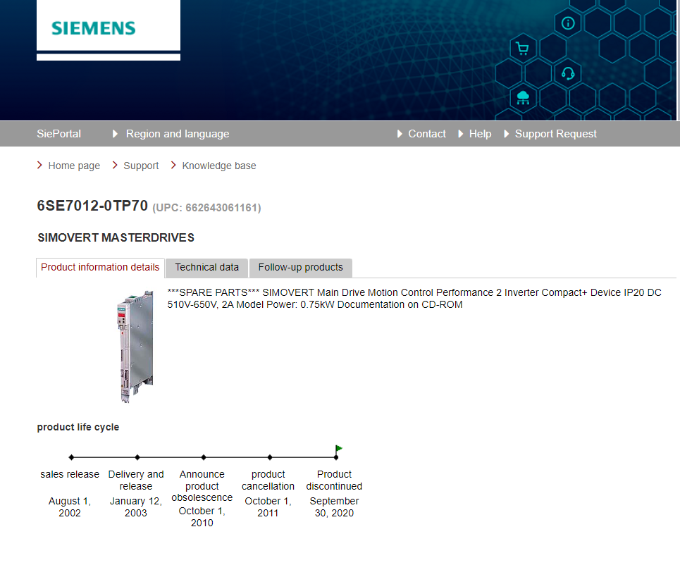 ***SPARE PARTS*** SIMOVERT Main Drive Motion Control Performance 2 Inverter Compact+ Device IP20 DC 510V-650V 6SE7012-0TP70-Z