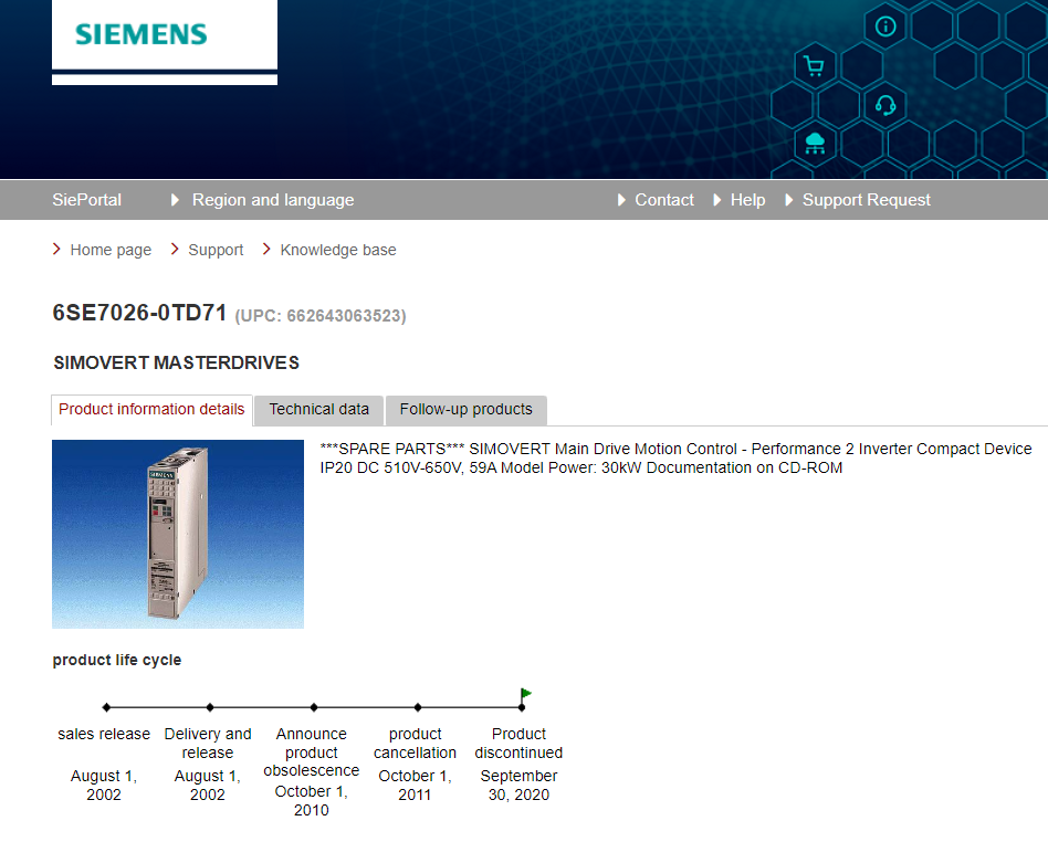 **SPARE PARTS*** SIMOVERT Main Drive Motion Control – Performance 2 Inverter Compact Device IP20 6SE7026-0TD71