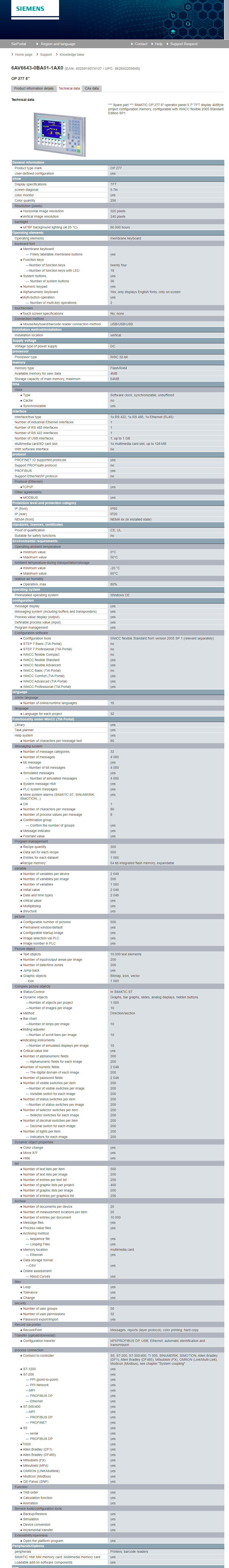 SIMATIC OP 277 6″ operator panel 5.7″ TFT display 4MByte project configuration memory 6AV6643-0BA01-1AX0