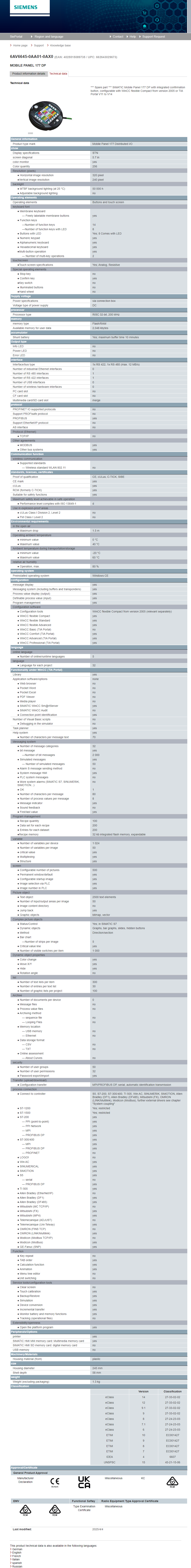 SIMATIC Mobile Panel 177 DP with integrated confirmation button 6AV6645-0AA01-0AX0