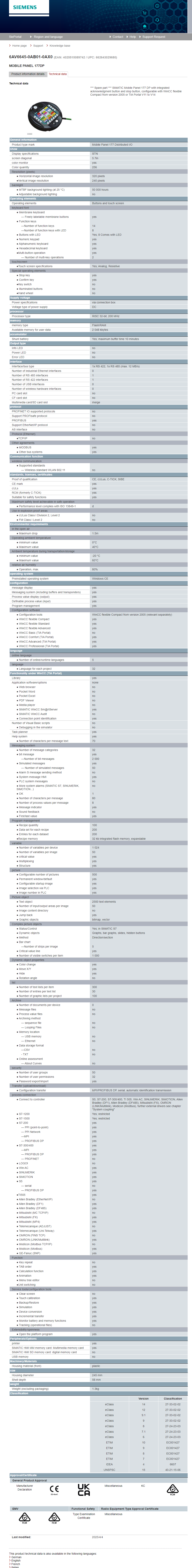SIMATIC Mobile Panel 177 DP with integrated acknowledgment button and stop button 6AV6645-0AB01-0AX0