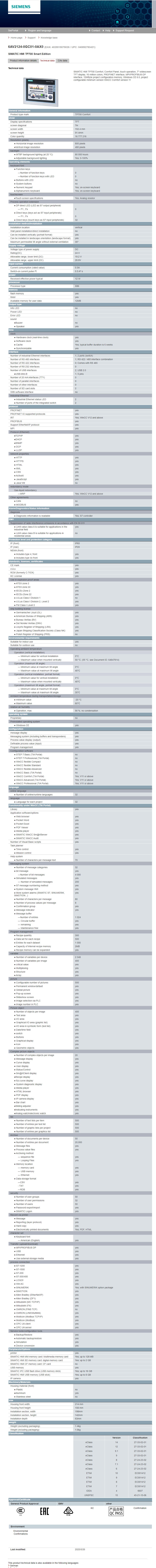 | SIMATIC HMI TP700 Comfort, Comfort Panel, touch operation, 7″ widescreen TFT display, 16 million colors, PROFINET interface, MPI/PROFIBUS-DP interface, 12MByte project configuration memory, Windows CE 6.0, project configurable minimum version WinCC Comfort version 11 |