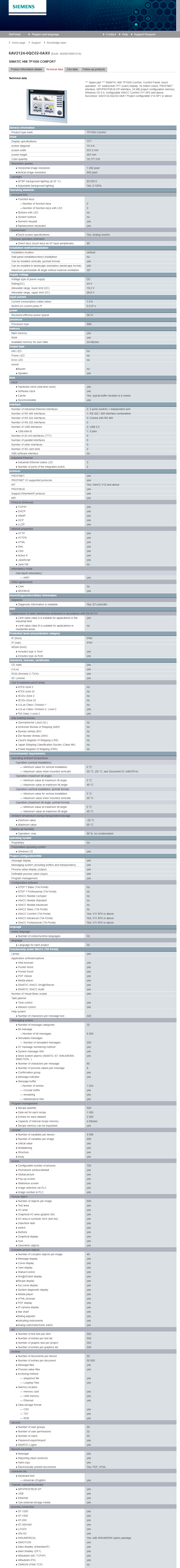 SIMATIC HMI TP1500 Comfort, Comfort Panel, touch operation, 15” widescreen TFT (color) display, 16 million colors, PROFINET interface, MPI/PROFIBUS-DP interface, 24 MB project configuration memory, Windows CE 6.0, configurable WinCC Comfort V11 SP2 and above, Successor: 6AV2124-0QC02-0AX1 Project configurable V14 SP1 or above