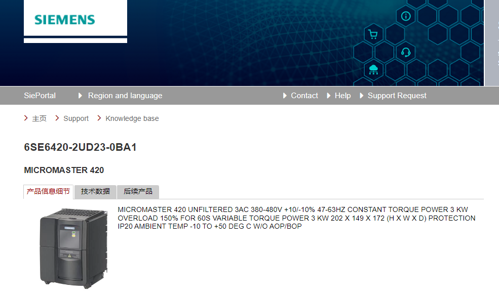 MICROMASTER 420 UNFILTERED 3AC 380-480V +10/-10% 47-63HZ CONSTANT TORQUE POWER 3 KW OVERLOAD 150% FOR 60S VARIABLE TORQUE POWER 3 KW 202 X 149 X 172 (H X W X D) PROTECTION IP20 AMBIENT TEMP -10 TO +50 DEG C W/O AOP/BOP