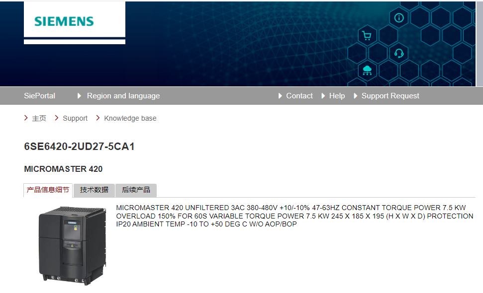 MICROMASTER 420 UNFILTERED 3AC 380-480V +10/-10% 47-63HZ CONSTANT TORQUE POWER 7.5 KW OVERLOAD 150% FOR 60S VARIABLE TORQUE POWER 7.5 KW 245 X 185 X 195 (H X W X D) PROTECTION IP20 AMBIENT TEMP -10 TO +50 DEG C W/O AOP/BOP