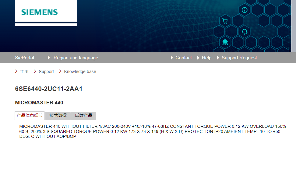 MICROMASTER 440 WITHOUT FILTER 1/3AC 200-240V +10/-10% 47-63HZ CONSTANT TORQUE POWER 0.12 KW OVERLOAD 150% 60 S, 200% 3 S SQUARED TORQUE POWER 0.12 KW 173 X 73 X 149 (H X W X D) PROTECTION IP20 AMBIENT TEMP. -10 TO +50 DEG. C WITHOUT AOP/BOP