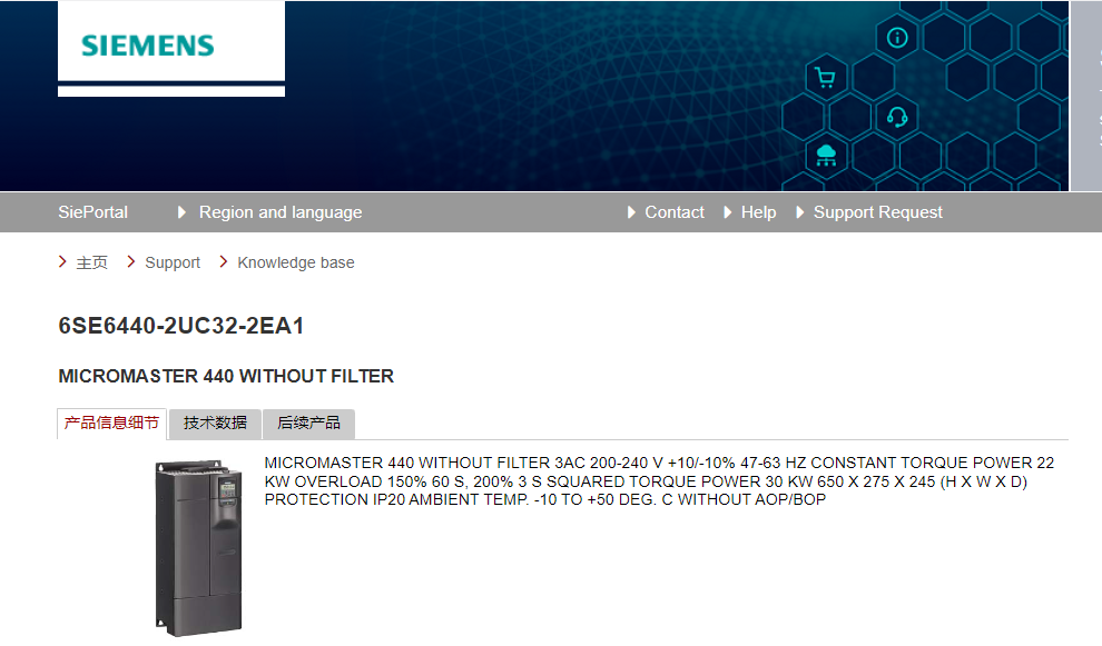 MICROMASTER 440 WITHOUT FILTER 3AC 200-240 V +10/-10% 47-63 HZ CONSTANT TORQUE POWER 22 KW OVERLOAD 150% 60 S, 200% 3 S SQUARED TORQUE POWER 30 KW 650 X 275 X 245 (H X W X D) PROTECTION IP20 AMBIENT TEMP. -10 TO +50 DEG. C WITHOUT AOP/BOP