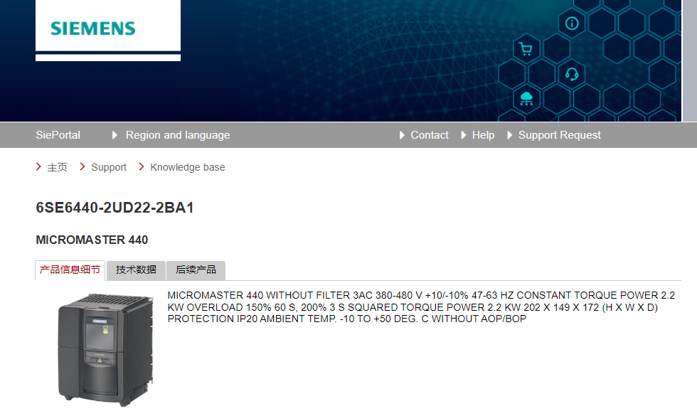 MICROMASTER 440 WITHOUT FILTER 3AC 380-480 V +10/-10% 47-63 HZ CONSTANT TORQUE POWER 2.2 KW OVERLOAD 150% 60 S, 200% 3 S SQUARED TORQUE POWER 2.2 KW 202 X 149 X 172 (H X W X D) PROTECTION IP20 AMBIENT TEMP. -10 TO +50 DEG. C WITHOUT AOP/BOP