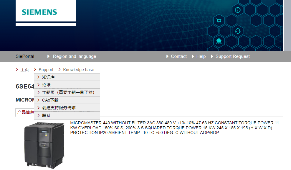 MICROMASTER 440 WITHOUT FILTER 3AC 380-480 V +10/-10% 47-63 HZ CONSTANT TORQUE POWER 11 KW OVERLOAD 150% 60 S, 200% 3 S SQUARED TORQUE POWER 15 KW 245 X 185 X 195 (H X W X D) PROTECTION IP20 AMBIENT TEMP. -10 TO +50 DEG. C WITHOUT AOP/BOP