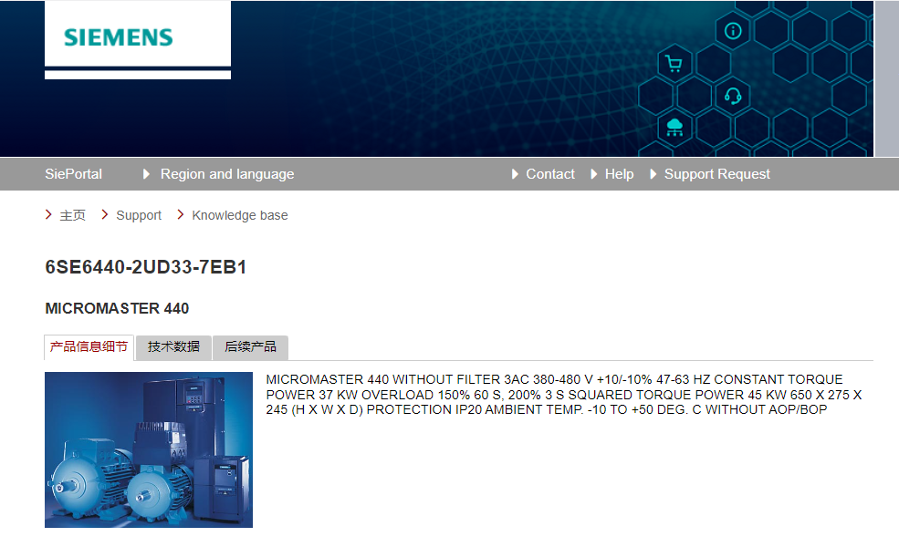 MICROMASTER 440 WITHOUT FILTER 3AC 380-480 V +10/-10% 47-63 HZ CONSTANT TORQUE POWER 37 KW OVERLOAD 150% 60 S, 200% 3 S SQUARED TORQUE POWER 45 KW 650 X 275 X 245 (H X W X D) PROTECTION IP20 AMBIENT TEMP. -10 TO +50 DEG. C WITHOUT AOP/BOP