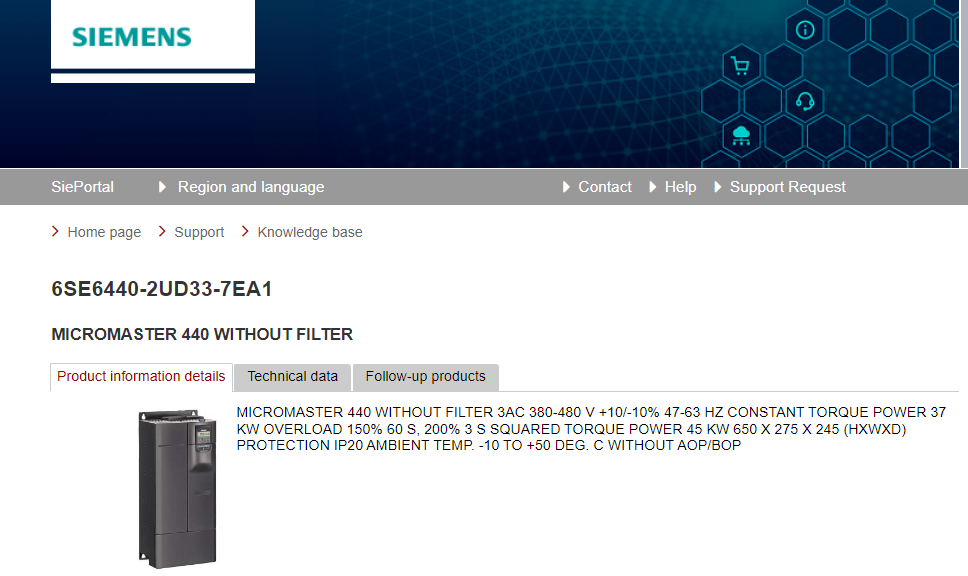 MICROMASTER 440 WITHOUT FILTER 3AC 380-480 V +10/-10% 47-63 HZ CONSTANT TORQUE POWER 37 KW OVERLOAD 150% 60 S, 200% 3 S SQUARED TORQUE POWER 45 KW 650 X 275 X 245 (H X W X D) PROTECTION IP20 AMBIENT TEMP. -10 TO +50 DEG. C WITHOUT AOP/BOP