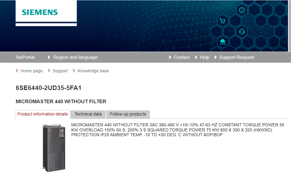 MICROMASTER 440 WITHOUT FILTER 3AC 380-480 V +10/-10% 47-63 HZ CONSTANT TORQUE POWER 55 KW OVERLOAD 150% 60 S, 200% 3 S SQUARED TORQUE POWER 75 KW 850 X 350 X 320 (HXWXD) PROTECTION IP20 AMBIENT TEMP. -10 TO +50 DEG. C WITHOUT AOP/BOP