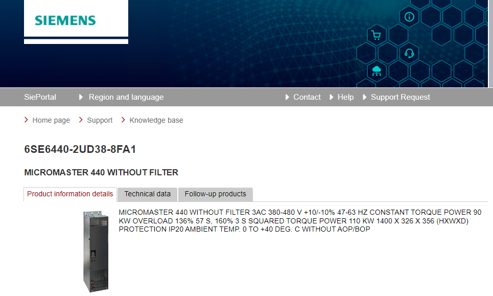 MICROMASTER 440 WITHOUT FILTER 3AC 380-480 V +10/-10% 47-63 HZ CONSTANT TORQUE POWER 90 KW OVERLOAD 136% 57 S, 160% 3 S SQUARED TORQUE POWER 110 KW 1400 X 326 X 356 (HXWXD) PROTECTION IP20 AMBIENT TEMP. 0 TO +40 DEG. C WITHOUT AOP/BOP