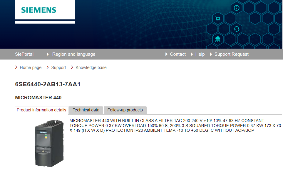 MICROMASTER 440 WITH BUILT-IN CLASS A FILTER 1AC 200-240 V +10/-10% 47-63 HZ CONSTANT TORQUE POWER 0.37 KW OVERLOAD 150% 60 S, 200% 3 S SQUARED TORQUE POWER 0.37 KW 173 X 73 X 149 (H X W X D) PROTECTION IP20 AMBIENT TEMP. -10 TO +50 DEG. C WITHOUT AOP/BOP