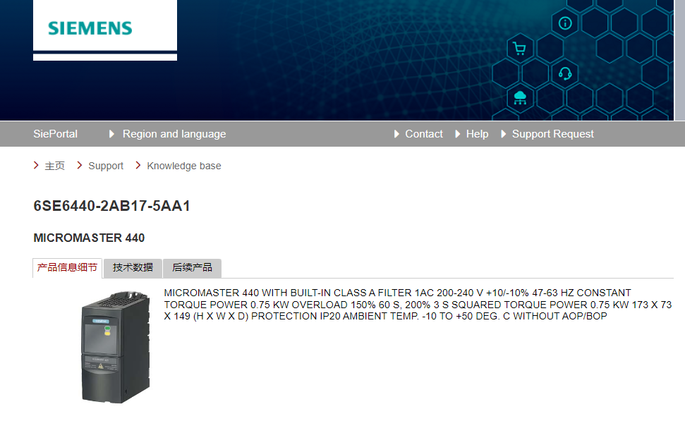 MICROMASTER 440 WITH BUILT-IN CLASS A FILTER 1AC 200-240 V +10/-10% 47-63 HZ CONSTANT TORQUE POWER 0.75 KW OVERLOAD 150% 60 S, 200% 3 S SQUARED TORQUE POWER 0.75 KW 173 X 73 X 149 (H X W X D) PROTECTION IP20 AMBIENT TEMP. -10 TO +50 DEG. C WITHOUT AOP/BOP