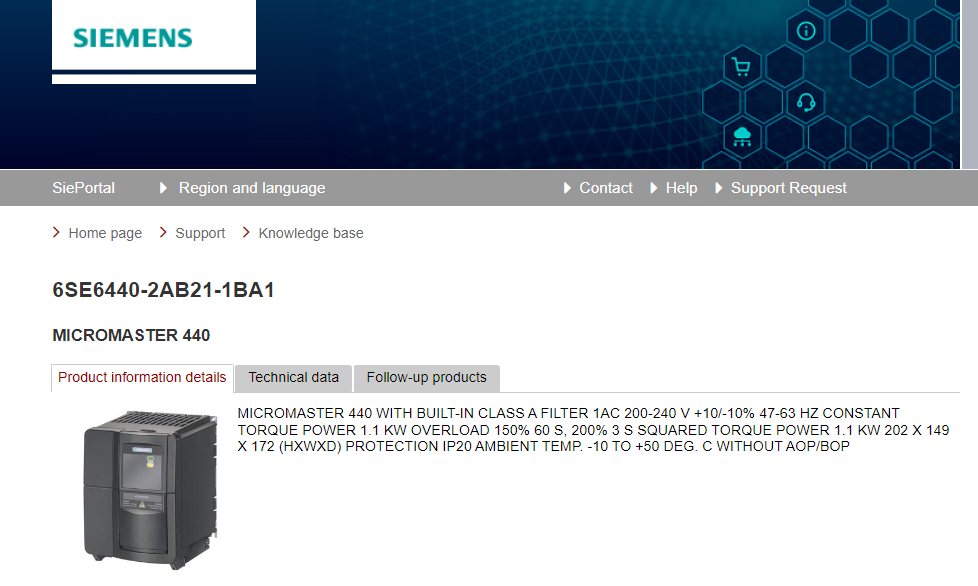 MICROMASTER 440 WITH BUILT-IN CLASS A FILTER 1AC 200-240 V +10/-10% 47-63 HZ CONSTANT TORQUE POWER 1.1 KW OVERLOAD 150% 60 S, 200% 3 S SQUARED TORQUE POWER 1.1 KW 202 X 149 X 172 (HXWXD) PROTECTION IP20 AMBIENT TEMP. -10 TO +50 DEG. C WITHOUT AOP/BOP