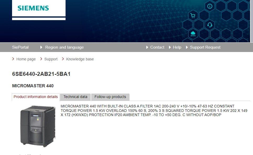 MICROMASTER 440 WITH BUILT-IN CLASS A FILTER 1AC 200-240 V +10/-10% 47-63 HZ CONSTANT TORQUE POWER 1.5 KW OVERLOAD 150% 60 S, 200% 3 S SQUARED TORQUE POWER 1.5 KW 202 X 149 X 172 (HXWXD) PROTECTION IP20 AMBIENT TEMP. -10 TO +50 DEG. C WITHOUT AOP/BOP