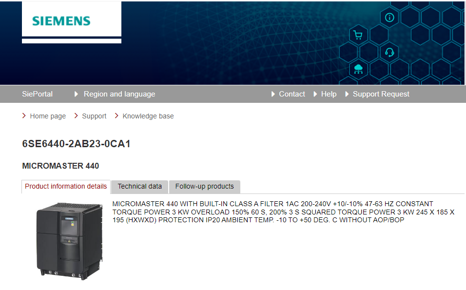 MICROMASTER 440 WITH BUILT-IN CLASS A FILTER 1AC 200-240V +10/-10% 47-63 HZ CONSTANT TORQUE POWER 3 KW OVERLOAD 150% 60 S, 200% 3 S SQUARED TORQUE POWER 3 KW 245 X 185 X 195 (HXWXD) PROTECTION IP20 AMBIENT TEMP. -10 TO +50 DEG. C WITHOUT AOP/BOP