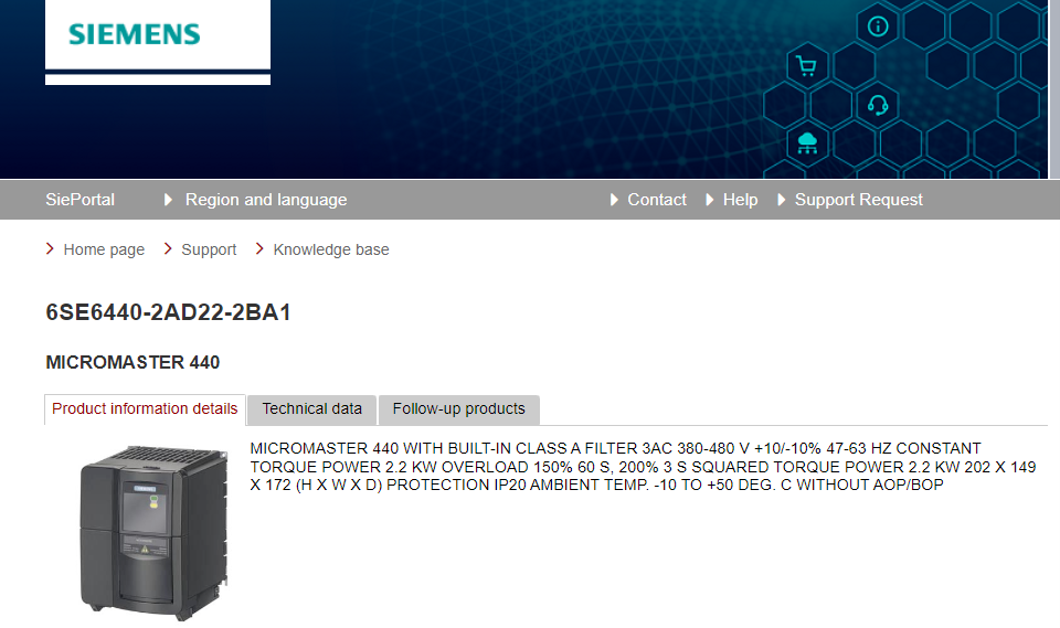 MICROMASTER 440 WITH BUILT-IN CLASS A FILTER 3AC 380-480 V +10/-10% 47-63 HZ CONSTANT TORQUE POWER 2.2 KW OVERLOAD 150% 60 S, 200% 3 S SQUARED TORQUE POWER 2.2 KW 202 X 149 X 172 (H X W X D) PROTECTION IP20 AMBIENT TEMP. -10 TO +50 DEG. C WITHOUT AOP/BOP