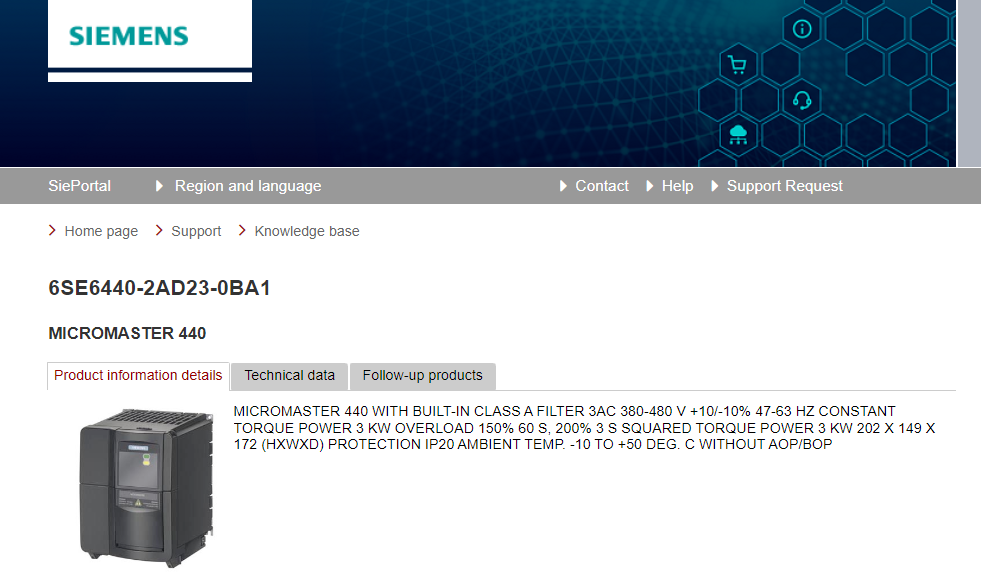 MICROMASTER 440 WITH BUILT-IN CLASS A FILTER 3AC 380-480 V +10/-10% 47-63 HZ CONSTANT TORQUE POWER 3 KW OVERLOAD 150% 60 S, 200% 3 S SQUARED TORQUE POWER 3 KW 202 X 149 X 172 (HXWXD) PROTECTION IP20 AMBIENT TEMP. -10 TO +50 DEG. C WITHOUT AOP/BOP