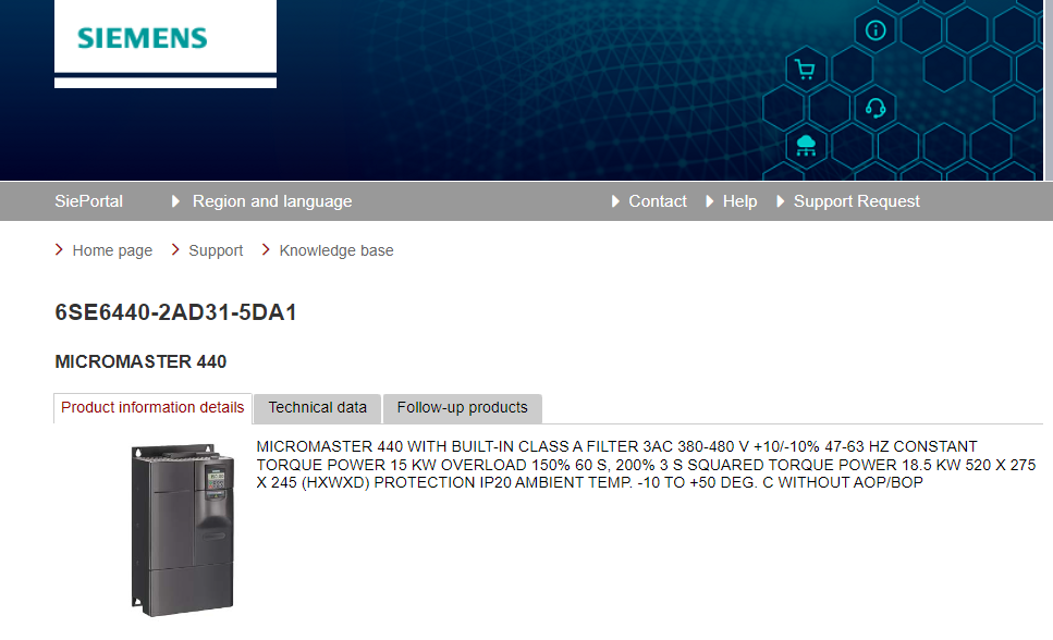 MICROMASTER 440 WITH BUILT-IN CLASS A FILTER 3AC 380-480 V +10/-10% 47-63 HZ CONSTANT TORQUE POWER 15 KW OVERLOAD 150% 60 S, 200% 3 S SQUARED TORQUE POWER 18.5 KW 520 X 275 X 245 (HXWXD) PROTECTION IP20 AMBIENT TEMP. -10 TO +50 DEG. C WITHOUT AOP/BOP