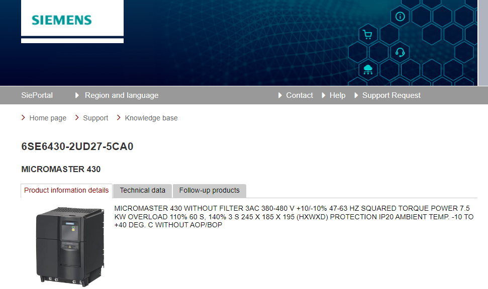 MICROMASTER 430 WITHOUT FILTER 3AC 380-480 V +10/-10% 47-63 HZ SQUARED TORQUE POWER 7.5 KW OVERLOAD 110% 60 S, 140% 3 S 245 X 185 X 195 (HXWXD) PROTECTION IP20 AMBIENT TEMP. -10 TO +40 DEG. C WITHOUT AOP/BOP