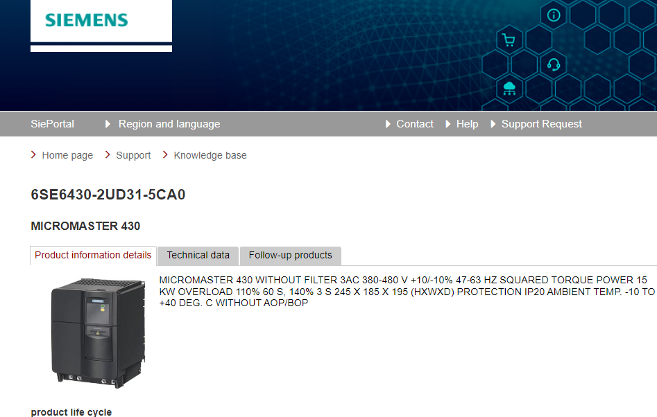 MICROMASTER 430 WITHOUT FILTER 3AC 380-480 V +10/-10% 47-63 HZ SQUARED TORQUE POWER 15 KW OVERLOAD 110% 60 S, 140% 3 S 245 X 185 X 195 (H X W X D) PROTECTION IP20 AMBIENT TEMP. -10 TO +40 DEG. C WITHOUT AOP/BOP