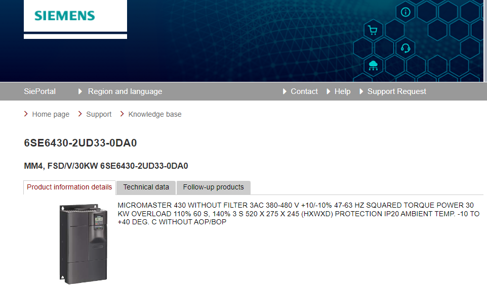 MICROMASTER 430 WITHOUT FILTER 3AC 380-480 V +10/-10% 47-63 HZ SQUARED TORQUE POWER 30 KW OVERLOAD 110% 60 S, 140% 3 S 520 X 275 X 245 (HXWXD) PROTECTION IP20 AMBIENT TEMP. -10 TO +40 DEG. C WITHOUT AOP/BOP